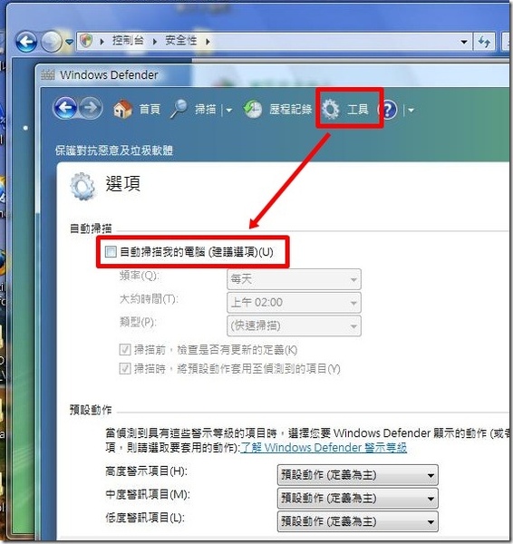接著,工具→選項→取消勾選〝自動掃瞄我的電腦(建議選項)〞