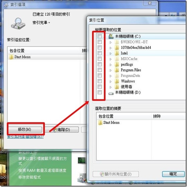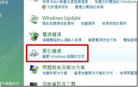 硬碟索引,簡單的說就是Vista幫你的電腦檔案做好分類,以便在搜尋的時候能快速的找到檔案,如果不在乎搜尋時多那一一點點的時間,或是很少在用搜尋功能的時候,可以將這個功能關掉。