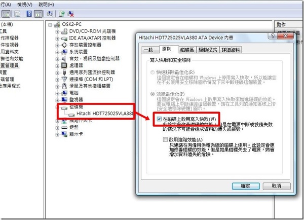 接著向上圖這樣勾選〝在磁碟上啟用寫入快取〞 ,就大公告成了。