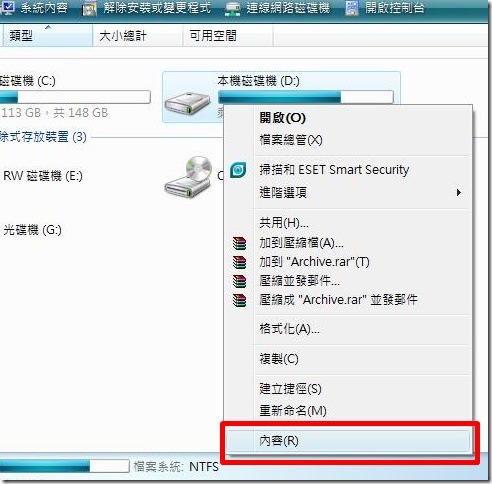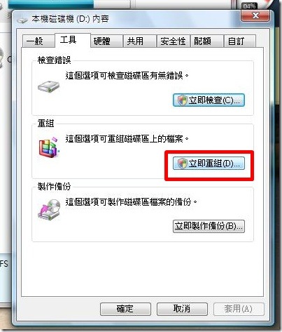 先開啟我的電腦→在想要關閉自動重組的硬碟上右鍵→內容