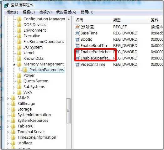 找到「EnablePrefetcher」跟「EnableSuperfetch」→右鍵→修改