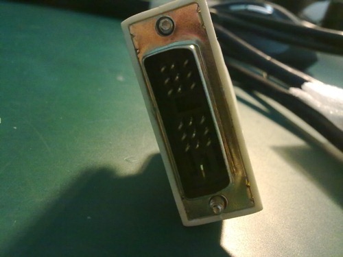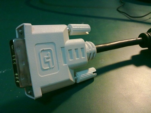 再來,隨附的DVI線材品質實在是令人不敢恭維,照相可能細節不太清楚,看這粗肥連接頭,而且這粗糙到我都覺得是廢塑膠料做成的,鄉民說的好,不爽不要用,好吧,別用了XD