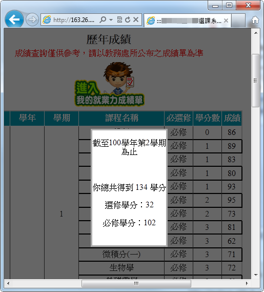 ▲沒有意外的話會算出學分並顯示出來(為了擷圖方便我才用IE的XD)