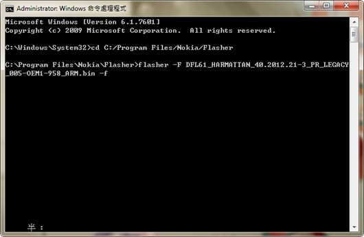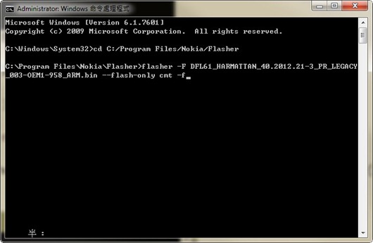 在視窗輸入 cd C:/Program Files/Nokia/Flasher (若是安裝目錄有改記得調整路徑)
